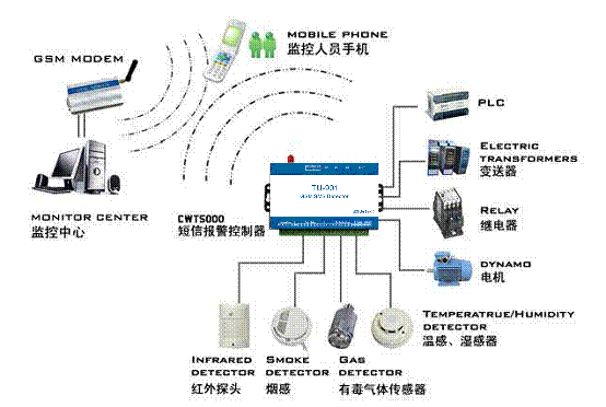 短信報警控制器內(nèi)嵌實時操作系統(tǒng),集遠程I/O控制和數(shù)據(jù)傳輸以及報警功能為一體,具有8路開關量信號輸入,8路開關信號輸出(可驅(qū)動繼電器)4路AD采樣接口和1個用來遠程數(shù)據(jù)通訊的RS-232接口,輸入信號異常報警內(nèi)容可由用戶自定義。可監(jiān)視測量以及控制安裝在遠程現(xiàn)場的傳感器和設備。