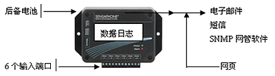 可6個傳感器,監控各種檢測設備和狀態。每個輸入端口可隨意地連接到溫度傳感器、模擬量傳感器、或干接點開關等。