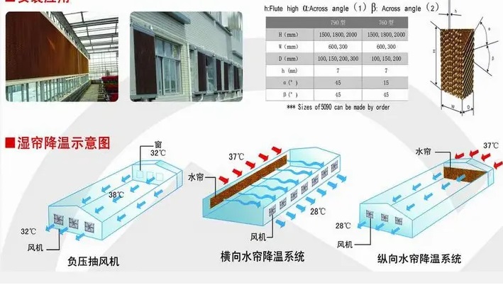 三、降溫系統(tǒng) 1、水簾:一般為紙質(zhì)材料,在炎熱夏季通風降溫使用。 2、濕簾:由波紋狀纖維紙粘結(jié)而成,水流均勻、風阻小、能承受較高的過簾風速,具有耐腐蝕,不易滋生苔菌,使用壽命長等特點,與風機組合能達到最佳通風降溫效果。