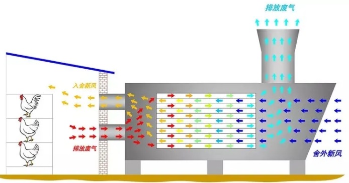 四、熱交換系統(tǒng) 熱交換系統(tǒng)通常由熱風爐、夾層風道、煙道、膨脹節(jié)、散風管、主風機、引風機及電氣溫控等構(gòu)成。能夠利用舍內(nèi)排出廢氣的熱量來預熱進入舍內(nèi)的新鮮空氣,為雞場提供新鮮空氣的同時,減少氨氣排放,保護周邊環(huán)境,節(jié)省供熱的能源成本。