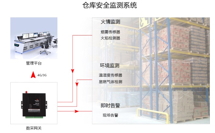 一、監測功能:對倉庫內電源、發電機、溫度、濕度、水浸、視頻、煙火、雷電、消防、門禁及空調進行實時監測。 二、報警功能:支持同時對多項數據超限報警,報警方式有云平臺消息、管理人員手機信息、現場聲光報警等,內容包括報警時間、報警內容、報警位置、發生時間、報警原因等。 三、聯動功能:可與其它設備實現豐富的場景聯動,互聯互通,比如倉庫內溫度過高自動啟動空調設備進行降溫處理;當倉庫內煙霧濃度超標自動啟動緊急滅火裝置等。 四、遠程管理的功能:在內部人員進入現場時,通過軟件系統遠程對紅外線探測器撤防,在人員離開時,再進行布防。 五、報表管理功能:自定義報表、數據查詢、數據維護等功能,報表能以曲線圖、柱形圖、餅圖等方式顯示,并支持數據導出功能. 六、賬號管理功能:系統采用多級權限管理的方式,對登錄賬號進行分級管理,劃分為管理、編輯、操作、只讀等群組。 智能倉儲在線報警、監控系統的應用,可以實現倉庫全天候、全時段的可視化監控,實時化、智能化對倉庫環境進行安全評估,提高預警能力,防范各種危險的出現,實現倉儲系統的精細化管理。