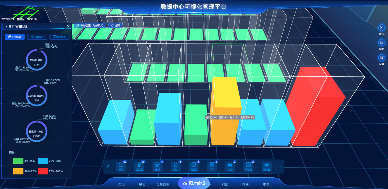 1、三維地圖布局:使用3D技術繪制數據中心和機房的平面圖,并在地圖上標記出重要設備、網絡線路和安全控制區域等。這樣可以更方便地查看和管理整個環境。 2、實時監控:安裝攝像頭和傳感器,將現場的數據實時傳輸到3D可視化平臺中。這樣可以隨時監控機房內的安全狀況,包括溫度、濕度、煙霧等。 3、安全隔離區域:使用3D技術將安全隔離區域標記出來,并在可視化平臺中設置相應的權限控制。只有授權人員才能進入這些區域,從而增強數據中心的安全性。 4、故障預警:通過3D可視化平臺,可以實時監測設備的狀態和性能指標。設置相應的警報系統,一旦出現異常情況,可以立即采取措施,避免故障的發生。 5、路線規劃:使用3D技術規劃機房的各種路徑,包括電力線路、網絡線路和緊急出口等。這樣可以更好地管理線纜,避免混亂和潛在的安全隱患。 6、可視化安全監控:將安全監控系統與3D可視化平臺集成,可以實時監測機房內的入侵、未授權訪問、異常活動等安全事件。這樣的系統可以提供警報和警示,以及記錄事件的日志和圖像。 總的來說,3D可視化技術可以提供全面的數據中心監控和管理,使用3D可視化技術與其他安全措施相結合,以提供全面的監控、報警和管理,確保機房的安全性和穩定性,幫助您打造一個安全的機房環境。