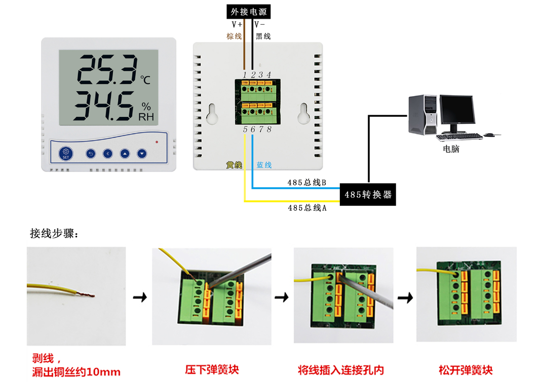 溫濕度傳感器能夠對一定范圍內的溫度、濕度進行檢測的設備,它通過RS485接口與其他監控系統結合,實現環境溫濕度的智能控制,在正式使用時應當正確接線。溫濕度傳感器的接線方式和絕大多數傳感器類似,一般可分為電源線、地線和信號線。其接線方法如下: