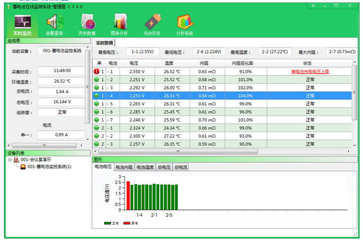 STU-BMS蓄電池檢測系統對蓄電池進行監測,獲取蓄電池電壓、內阻、溫度、總電壓、總電流等信息,并具有更高的穩定性,以及精度。為蓄電池組狀態的查詢分析、維護提供更大的助力。