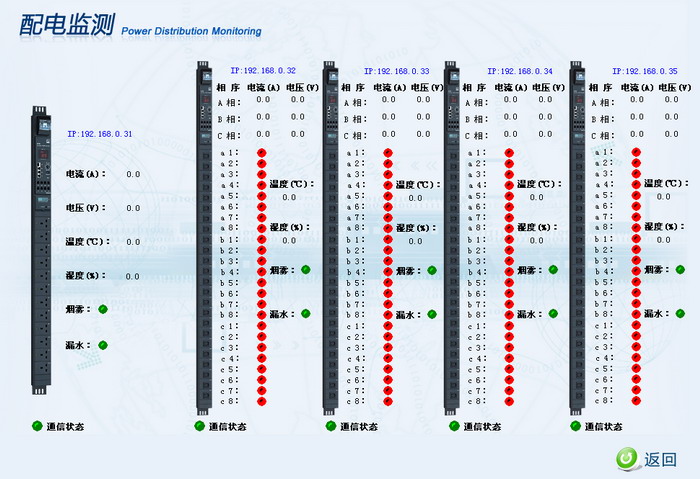 1、配電柜:監測一級、二級交流配電柜的主回路和各分回路的各種參數如電壓、電流、頻率、有功功率、功率因數、無功功率、視在功率等。