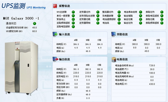 3、UPS:監測輸入/輸出電壓、電流、頻率、功率,蓄電池組的電壓、后備時間、溫度等參數,整流器、逆變器、電池、旁路、負載等部件的狀態。